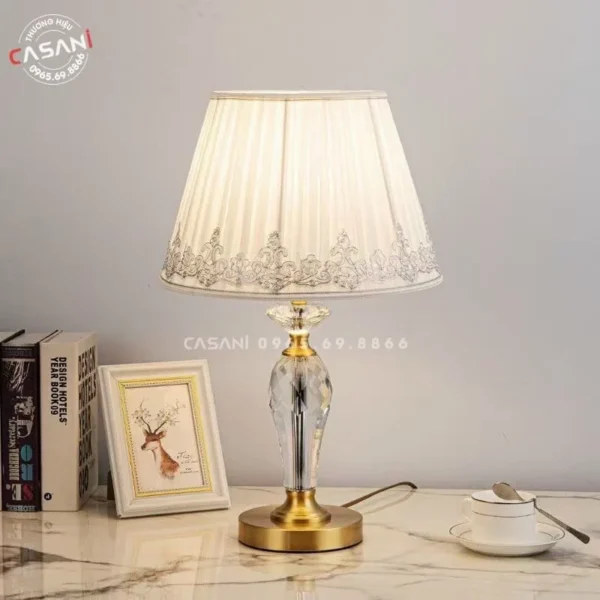 Đèn bàn thủy tinh / pha lê: Là sự lựa chọn hoàn hảo cho không gian sang trọng. Pha lê hoặc thủy tinh trong suốt giúp ánh sáng được phản chiếu lung linh, làm nổi bật sự quý phái của căn phòng, đặc biệt phù hợp với biệt thự, khách sạn hoặc phòng ngủ phong cách luxury.