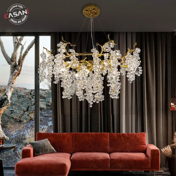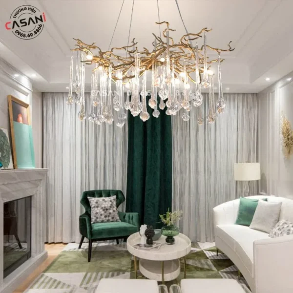 Phòng khách là nơi gia đình quây quần, tiếp đón bạn bè và khách khứa. Một chiếc đèn chùm đồng với kiểu dáng tinh xảo, kết hợp pha lê hoặc đá tự nhiên sẽ ngay lập tức nâng tầm đẳng cấp của không gian.