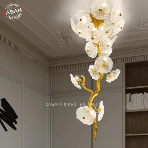 Được chế tác từ đồng và kết hợp với các chất liệu khác như pha lê hoặc thủy tinh, đèn chùm thông tầng không chỉ làm đẹp cho không gian mà còn trở thành một điểm nhấn nổi bật.