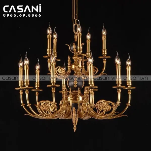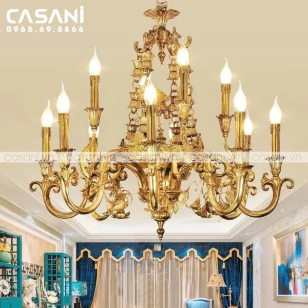 Thiết kế đèn tay nến mang phong cách hoàng gia, gợi nhớ đến những mẫu đèn chùm cổ điển từng được sử dụng trong các cung điện châu Âu. Các tay đèn được chế tác tinh xảo, uốn lượn mềm mại, tạo cảm giác cổ điển nhưng vẫn mang nét hiện đại thanh lịch. Kiểu dáng tay nến giúp ánh sáng tỏa ra đồng đều, tạo hiệu ứng lung linh, huyền ảo, giúp không gian thêm phần ấm cúng và đẳng cấp.