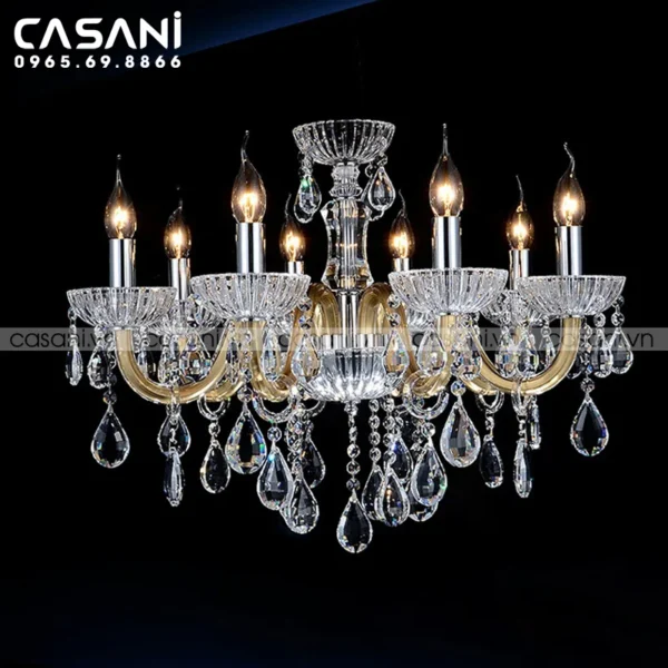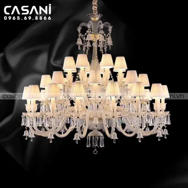 Những mẫu đèn chùm pha lê tại Casani được chế tác từ chất liệu pha lê cao cấp, tạo nên vẻ đẹp lấp lánh và đẳng cấp. Sản phẩm này không chỉ mang lại ánh sáng lung linh mà còn thể hiện gu thẩm mỹ tinh tế của gia chủ. Đèn chùm pha lê rất phù hợp cho phòng khách, sảnh lớn, hoặc các không gian cần sự nổi bật.