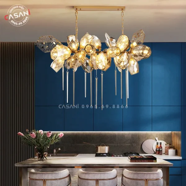 Các mẫu đèn chùm dành riêng cho khu vực bàn ăn tại Casani được thiết kế để tạo điểm nhấn, mang đến không gian ấm áp và thân mật. Chất liệu và kiểu dáng đa dạng như đèn pha lê, đèn mây tre, hay đèn hiện đại giúp bạn dễ dàng chọn lựa theo sở thích.