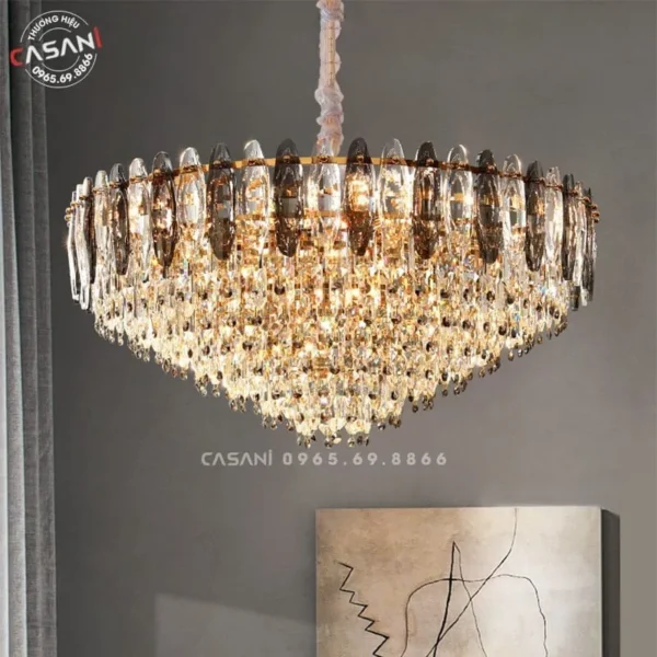 Những mẫu đèn chùm pha lê tại Casani được chế tác từ chất liệu pha lê cao cấp, tạo nên vẻ đẹp lấp lánh và đẳng cấp. Sản phẩm này không chỉ mang lại ánh sáng lung linh mà còn thể hiện gu thẩm mỹ tinh tế của gia chủ. Đèn chùm pha lê rất phù hợp cho phòng khách, sảnh lớn, hoặc các không gian cần sự nổi bật.