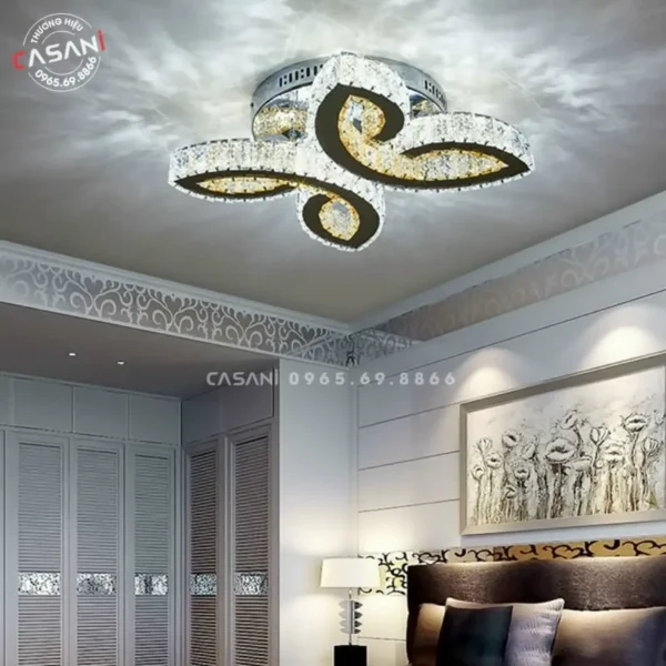 Điểm nhấn của bông hoa là phần nhụy hoa được sử dụng những viên pha lê cao cấp được các nghệ nhân gia công chi tiết , đảm bảo độ sắc nét và xuyên sáng đặc trưng của chất liệu pha lê. Đèn DMH-6821-80 khi tắt điện bản thân nó đã là một tác phẩm nghệ thuật, tới khi bật lên, những bóng đèn Led hoặc những dải led màu sẽ phản chiếu tới các viên pha lê trong suốt, khúc xạ những tia sáng đa màu sắc để tạo nên một không gian vô cùng lung linh huyền ảo.