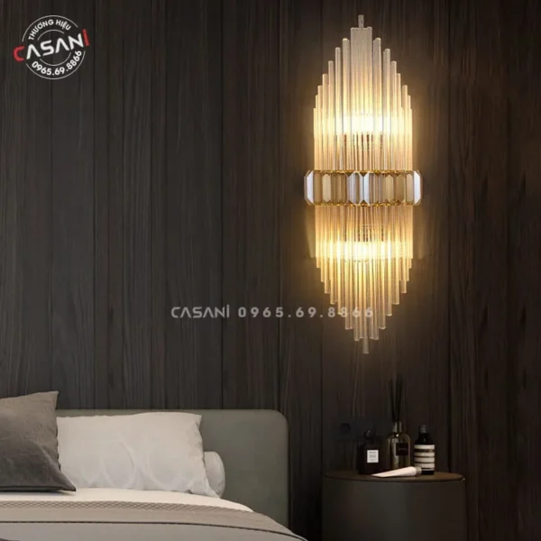 Pha lê – đặc biệt là pha lê K9 hoặc pha lê Swarovski – thường được sử dụng trong các mẫu đèn tường cao cấp để tạo hiệu ứng phản chiếu ánh sáng lung linh, sang trọng.